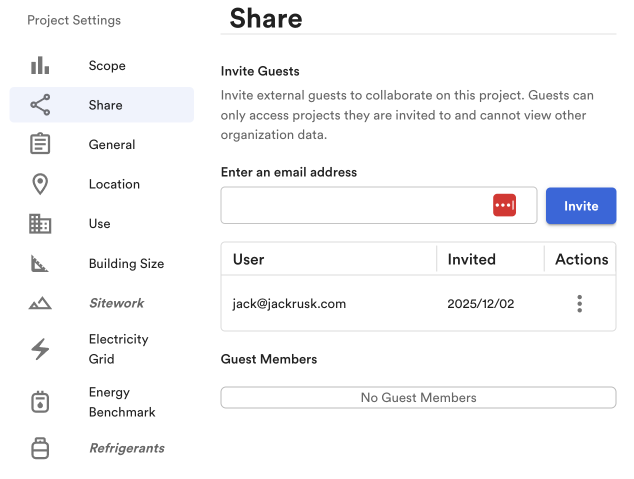 This will open the **Project Settings** panel with Share selected. This is where you can send or invitations, view current external project members, and remove guests from the project.