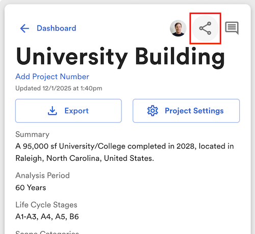 To share, click the share icon in the upper left hand project panel (or navigate to sharing within the **Project Settings** panel)